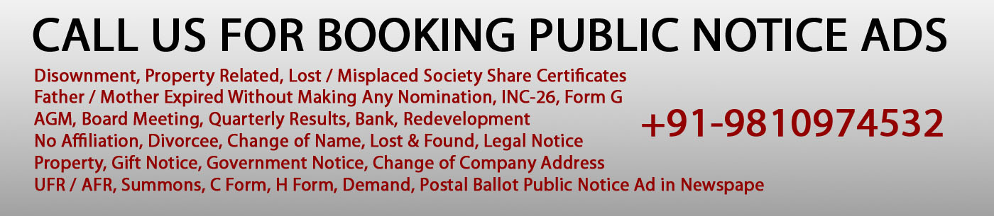 Book Public Notice Ad in any city, any language, any newspaper pan India with us by calling or whatsapp on 9810974532 and by email info@getmeup.in.